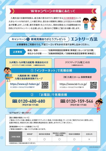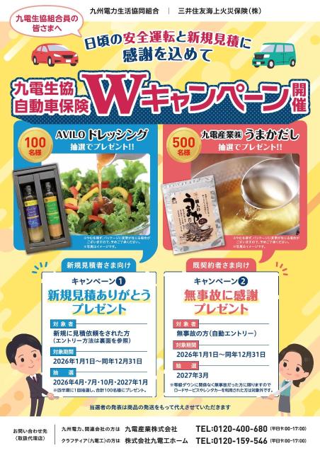 詳しくは、九電生協団体扱自動車保険Wキャンペーンチラシでご確認ください。